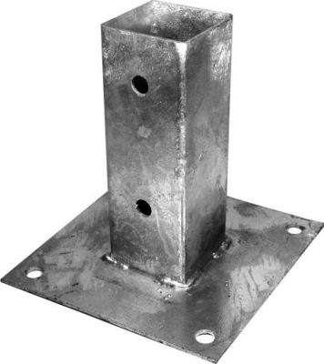 Центрально-фиксированный якорь для поддержания столба для застегивания и установки в бетон.слот вырезан в основании деревянного столба, чтобы поместиться над поддержкой столба, давая аккуратную отделку с только болтами, показывающими.